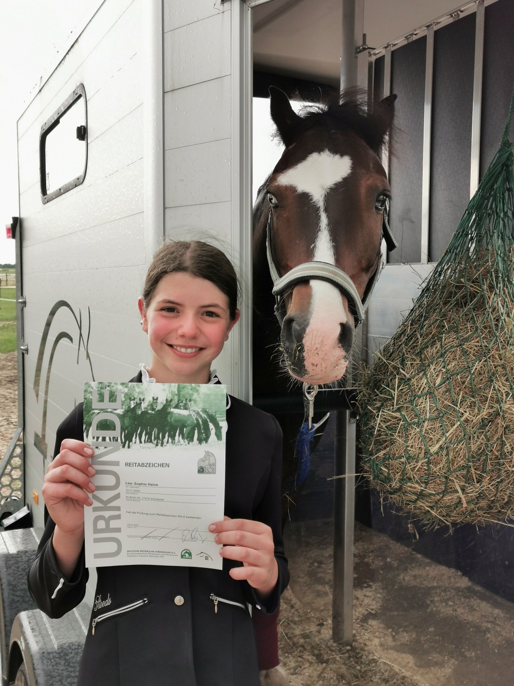 Im Springen musste Lea-Sophie gestern leider kurzfristig von Nick auf Frau Bär umsteigen. Die beiden absolvieren den Springparcours erfolgreich, und damit hatte Lea-Sophie das Reitabzeichen 6 in der Tasche.