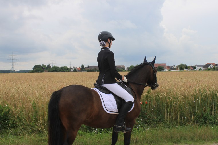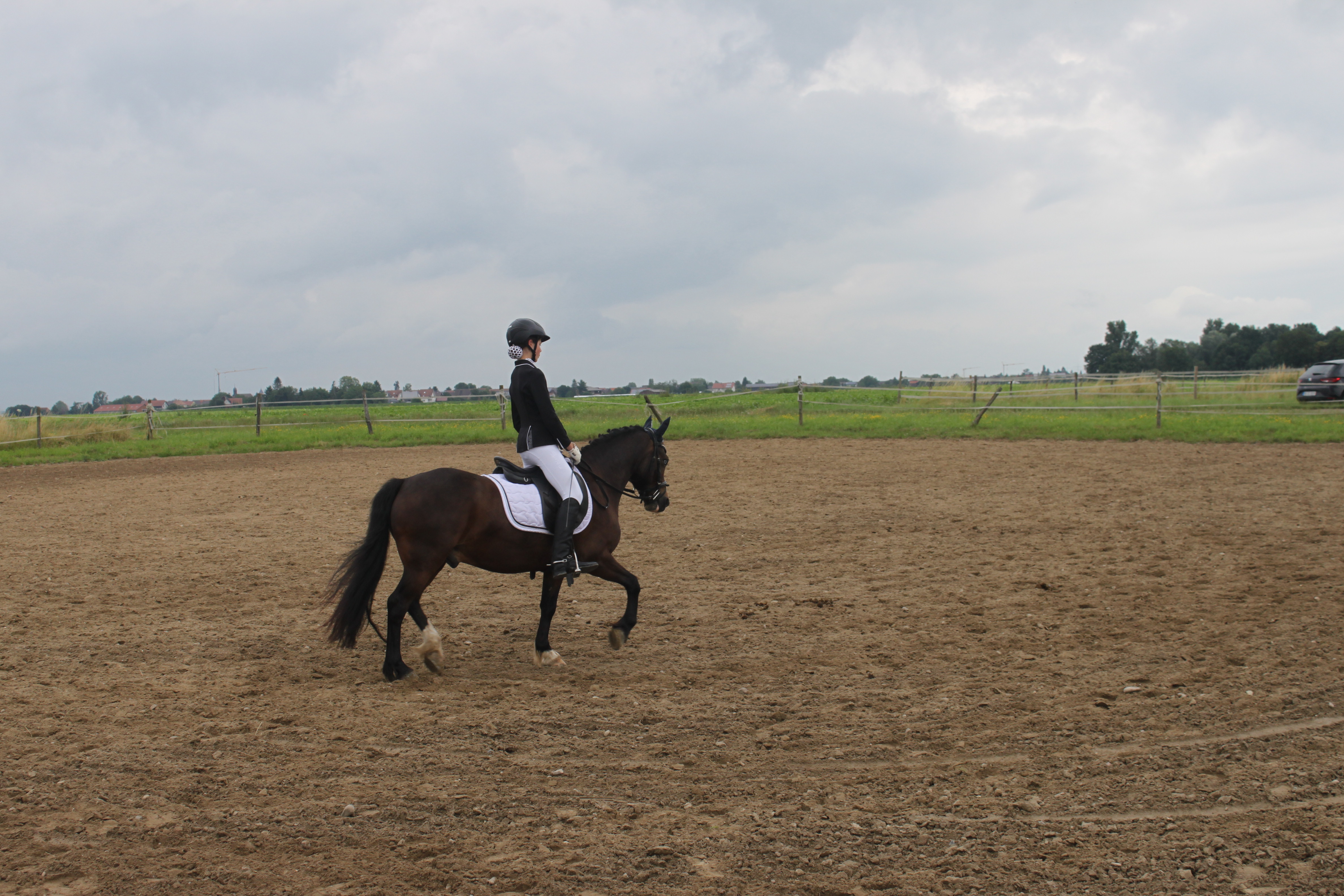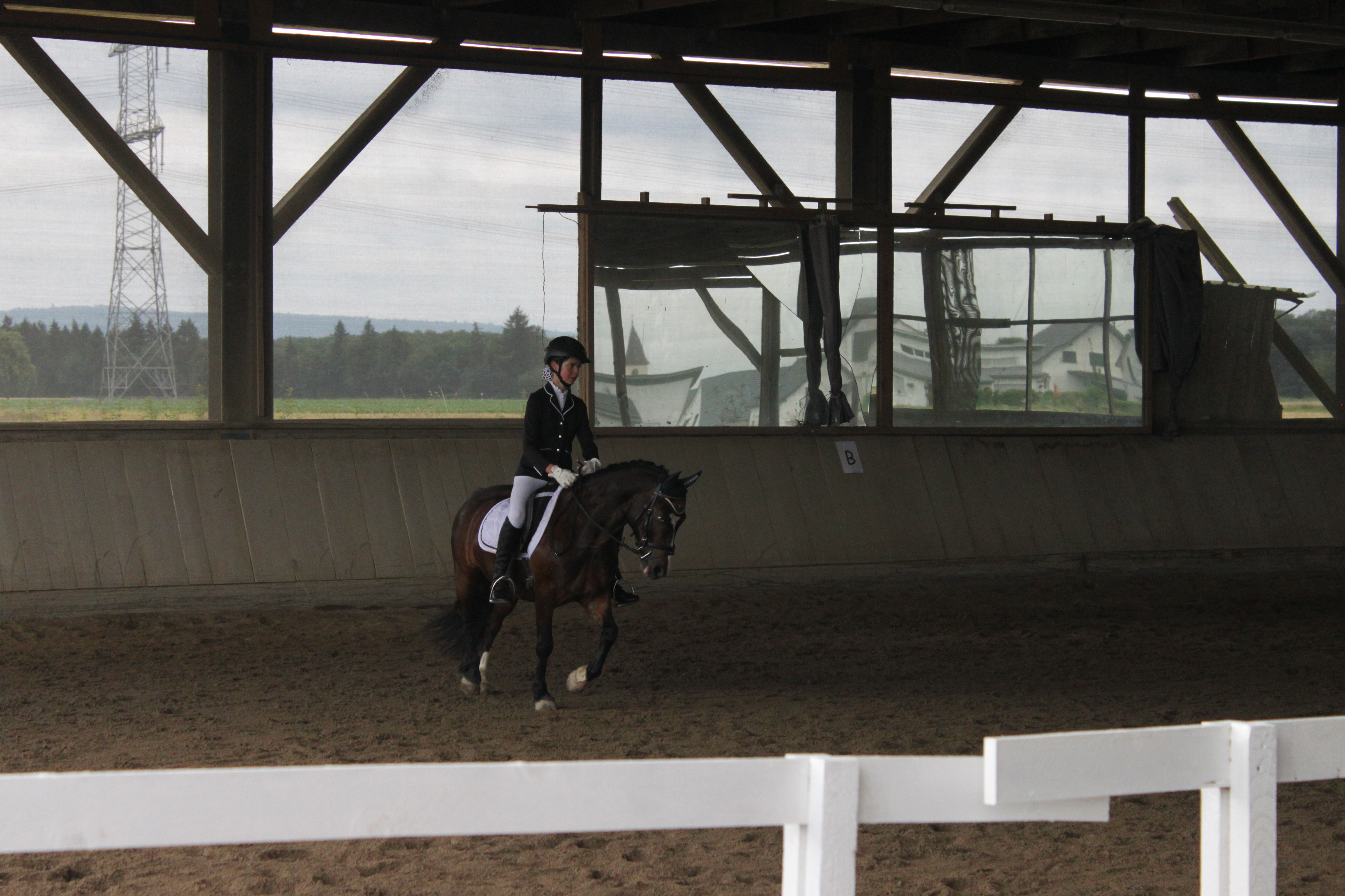 Begonnen wurde mit dem Vormustern, dem Vorführen des Pferdes an der Hand. Nach der sich anschließenden Theorieprüfung stand dann zunächst die Dressurprüfung auf dem Programm, die Lea-Sophie mir Nick sehr gut meisterte.
