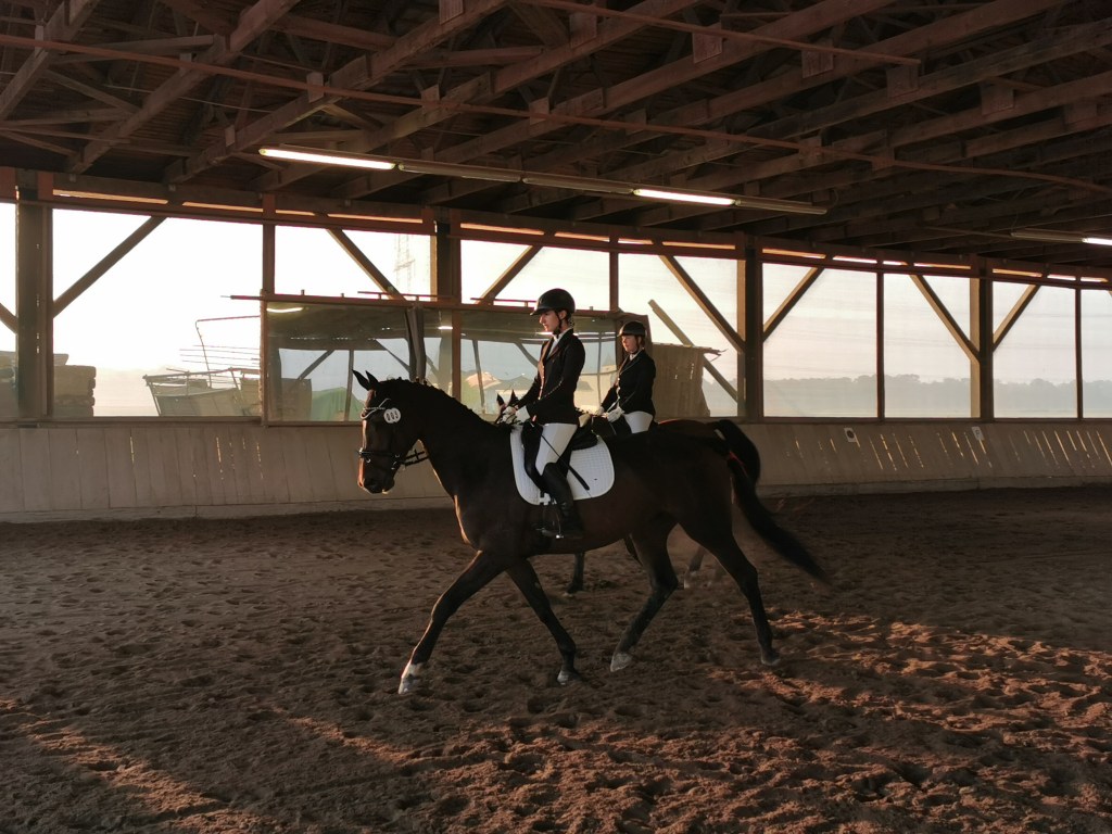 Danach ging auch Lina mit Bella an den Start. Auch die beiden zeigten einen guten Ritt, hier war es allerdings ihr eigenes Spiegelbild, das Bella kurzzeitig aus dem Konzept brachte. Am Ende stand eine 6,8 in der ersten gemeinsamen E-Dressur!