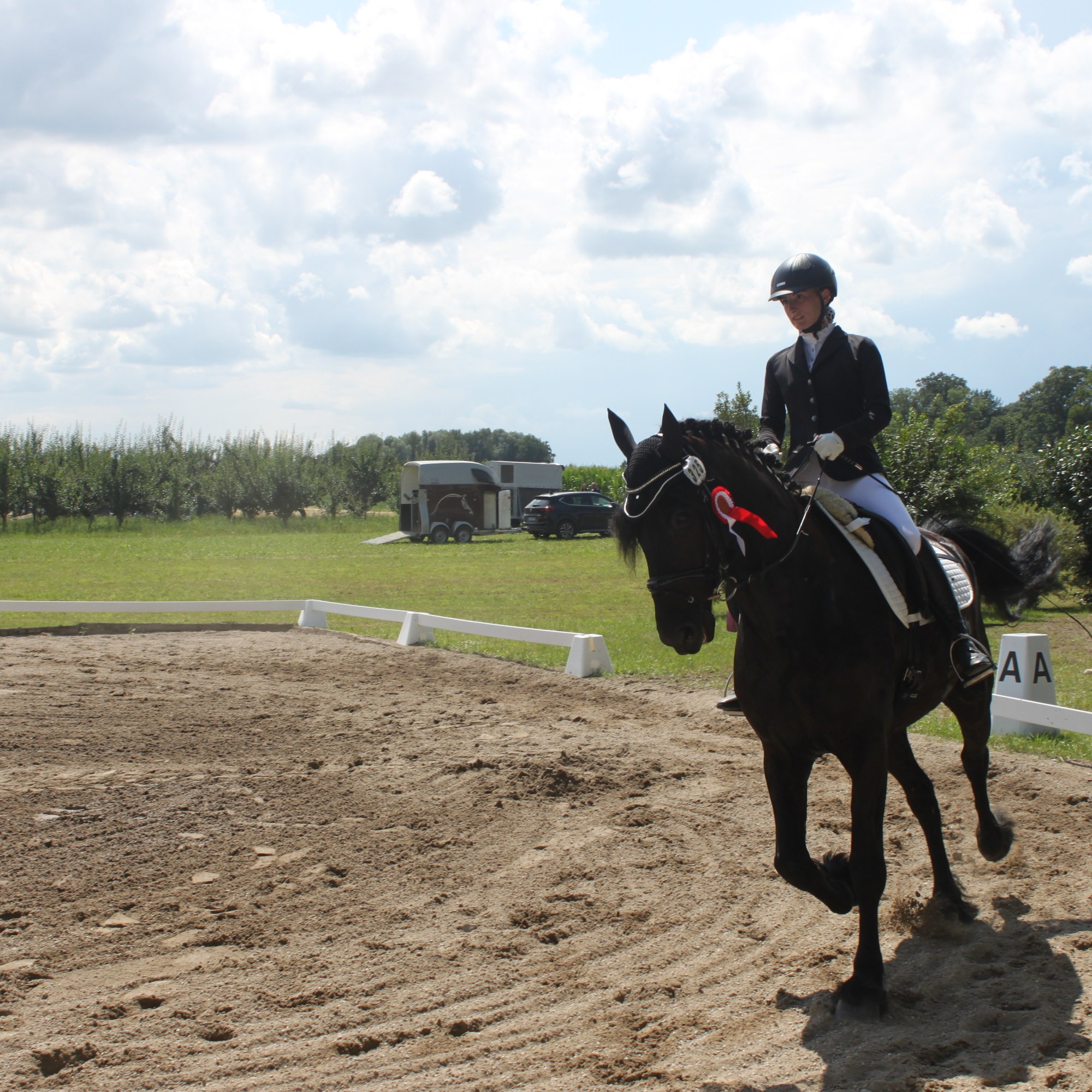 In Vorbereitung auf seine Turniereinsätze trainiert er neben dem Platz auch das Verladen und Hänger fahren. Außerdem sind wir mit ihm auch auf andere Anlagen gefahren, um ihn langsam an fremde Umgebungen zu gewöhnen.